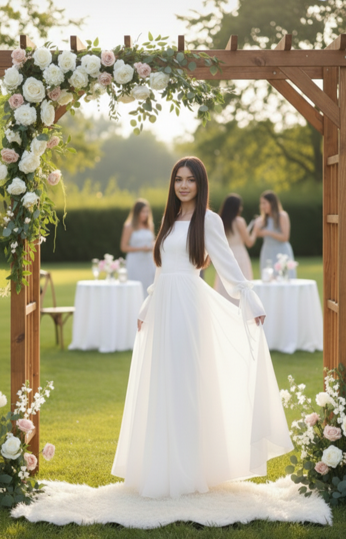שמלה מבד שיפון נשפכת עם שרוולים תואמים וקשירת דמוי מחוך בגב