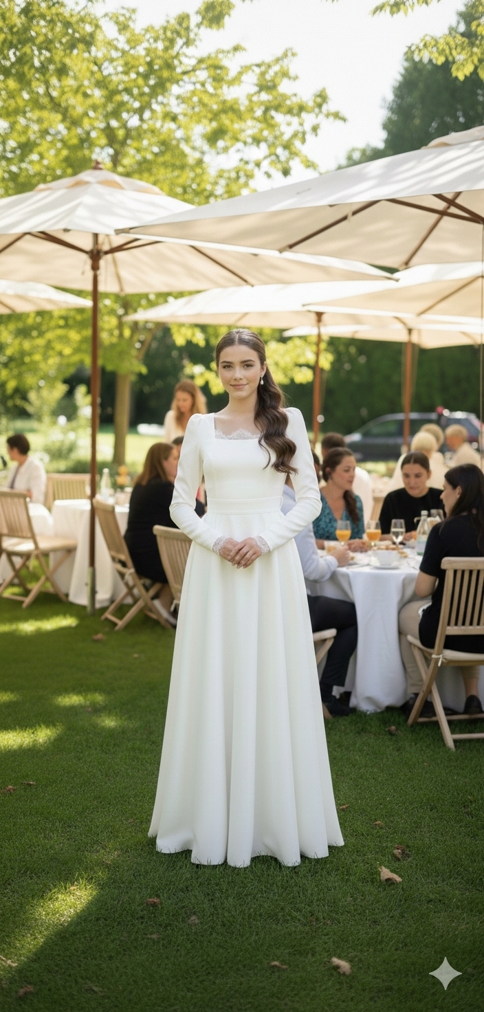שמלה מבד פודנש לייקרה בצבע לבן בגזרה נסיכותית נשפכת מהמותן עם פתח צוואר מרובע משולב תחרה
