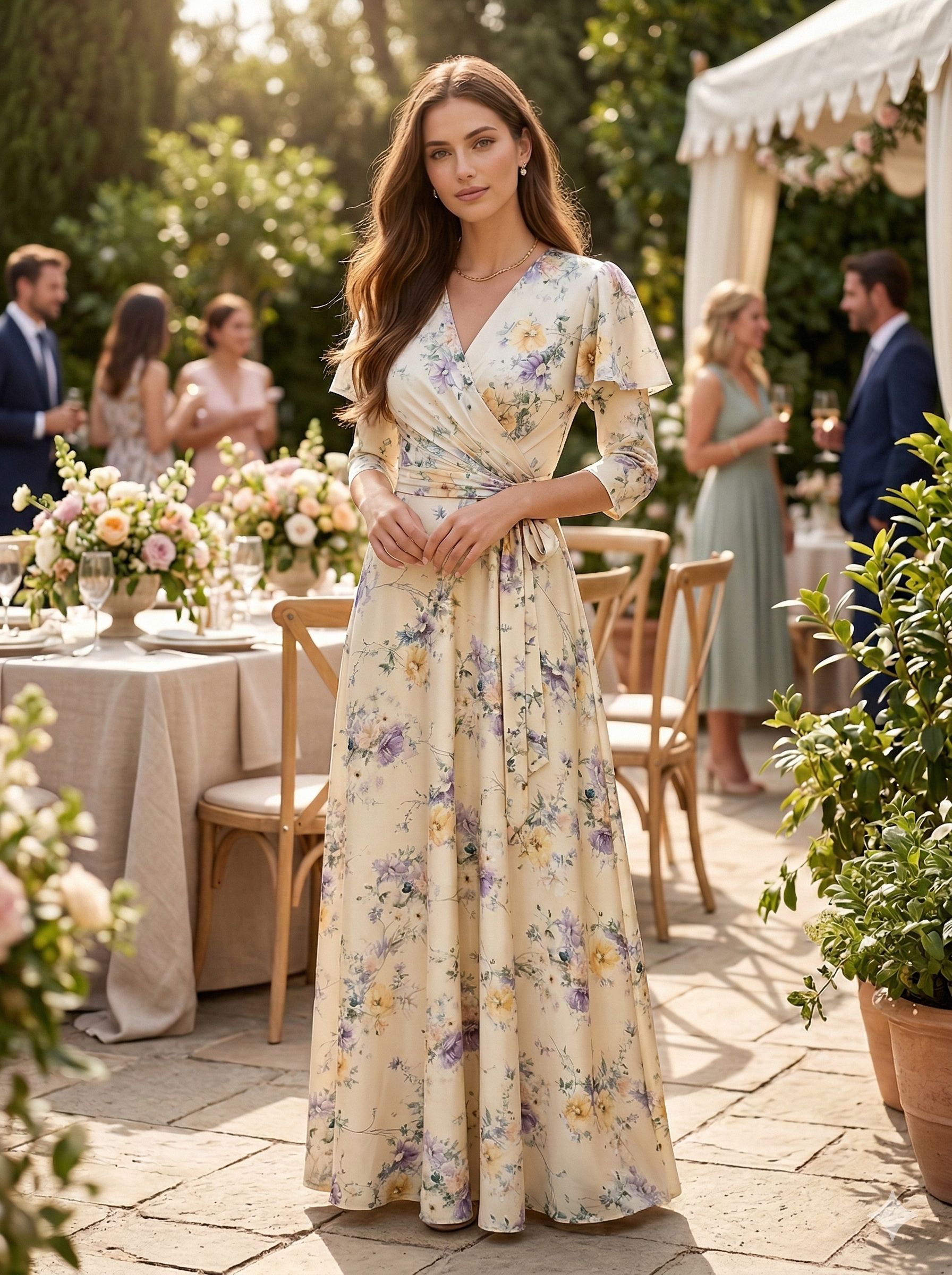 שמלת סאטן פרחונית בגווני הצהוב בגזרת מעטפת קלאסית עם שרוולי וולן עדינים למראה אביבי במיוחד